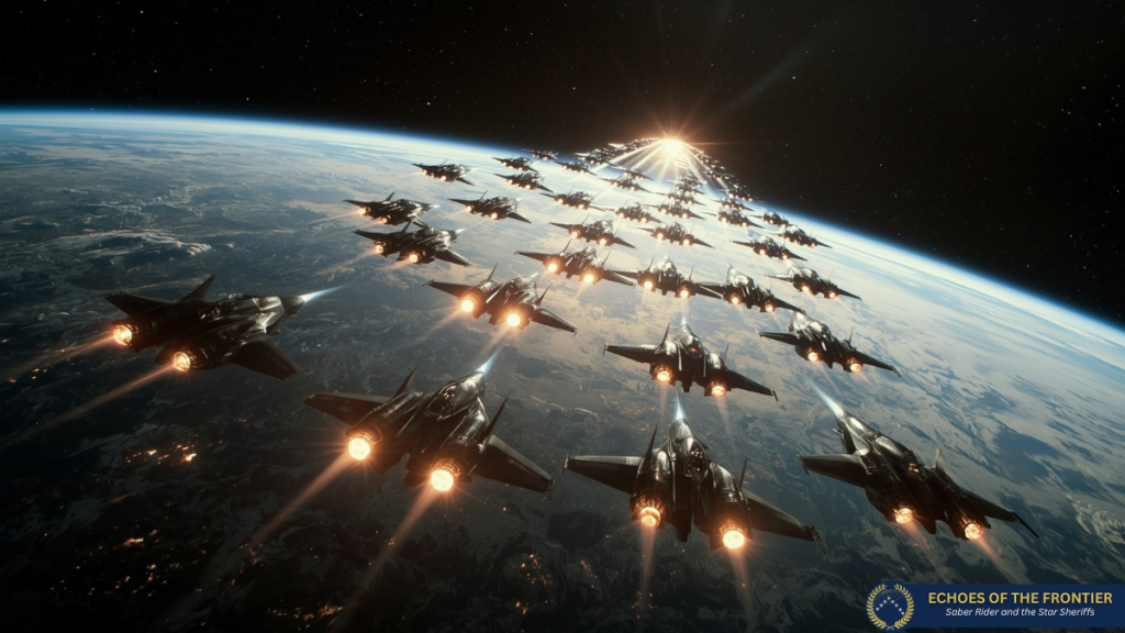 Captain Hikaris Geschwader flog bereits in V-Formation Richtung Orbit und er staffelte seine Männer in Einheiten auf. Plötzlich, wie aus dem Nichts, blinkten immer mehr feindliche kleine, schnelle Raumschiffe im Orbit von Jarr auf. Shinjiro sah ungläubig auf den kleinen Ortungsschirm in seinem Jet: „Na, ganz toll! Das ist alles eine grün rote Suppe da draußen!“ sagte er und drückte seinen Schubregler kraftvoll durch und gab die Anweisung des Ausschwärmens: „Und keine Solonummern! Jeder mit seinem Wingman!“, mahnte er, als er das Aufgebot der feindlichen Schiffe nun live vor sich erblickte.