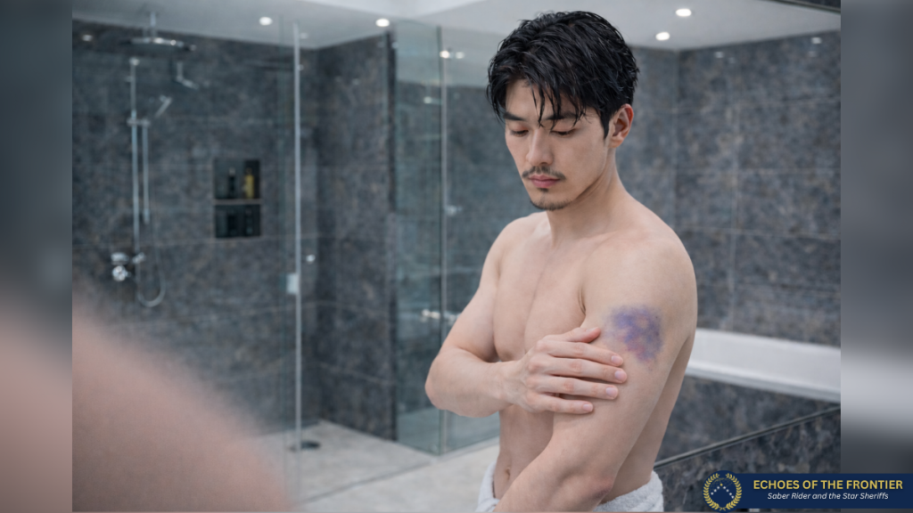 Er trat aus der Dusche, mit einem Handtuch fuhr er sich durch die Haare, wischte grob über sein Gesicht und Schultern. Der Dampf begann sich zu lichten, der Spiegel vor ihm zeigte zunächst nur seine verschwommene Silhouette. Er trat näher und wischte mit der flachen Hand über das Glas und sein Blick wurde klarer und blieb an seinem rechten Oberarm hängen, dort prangte ein großer, dunkelblauer Fleck und zog sich fast über den gesamten Oberarm. Die Haut war dort geschwollen, gelblich-violette Ränder zeichneten sich bereits ab. Die Kanüle hatte eindeutig zu lange in seinem Arm gesteckt und dann war da noch Royus nicht besonders sanfter Tritt gewesen, der sein Übriges getan hatte. Shinjiro verzog das Gesicht, als er vorsichtig mit den Fingern darüberstrich: „Royu, mein Retter in der Not“, murmelte er und musste trotz allem grinsen. Er ließ die Hand sinken und betrachtete sich im Spiegel. Seine Augen wirkten noch müde, aber er war wacher als zuvor. Und verließ das Badezimmer, um sich anzuziehen.