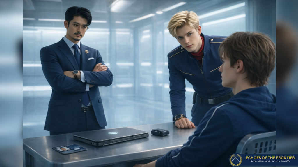 Im Arrestbereich musste sich Delweg einer gründlichen Leibesvisitation unterziehen. Anschließend erhielt er die vorgeschriebene Hygienekleidung. Seine sämtlichen Geräte, wie Laptop, Communicator und der Frequenz-Abfänger wurden sichergestellt und vor ihm auf einem metallenen Tisch ausgelegt. Kurz darauf wurde Lieutenant Delweg von zwei Wachen und einem Arzt in den Verhörraum gebracht, wo bereits Saber und Captain Hikari warteten: „Er ist sauber“, erklärte der Arzt knapp und setzte seine Unterschrift unter das Formular. Die Wachen drückten Delweg auf einen Stuhl. Captain Hikari trat einen Schritt näher: „Sie werden uns doch sicher mitteilen wollen, wie Sie in den Besitz eines Contact Transmitters gekommen sind, besonders nach der unerfreulichen Situation von eben“, sagte er ruhig, aber mit Nachdruck.
