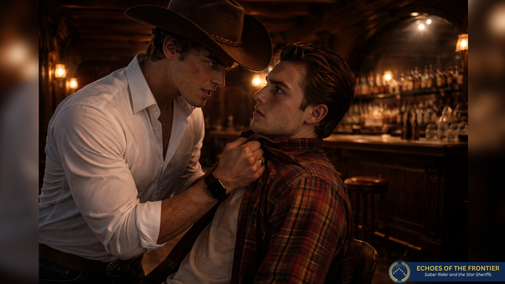 Da wollte Colt erneut ausholen, doch in diesem Moment ging hinter ihm die Saloontür schwungvoll auf: „Was ist hier los?“, hallte eine tiefe Stimme durch den Raum. Ruckartig drehte sich Colt zur Tür und kniff fast schmerzhaft seine Augen zusammen, die tief stehende Sonne fiel grell durch die geöffnete Tür und blendete ihn, sodass er zunächst nur die Umrisse von drei Männern erkennen konnte. Dann hörte er ihre Schritte, jeder einzelne setzte dumpf auf den Holzdielen auf und ließ das Holz leise knarren und hallte wie ein drohendes Echo.